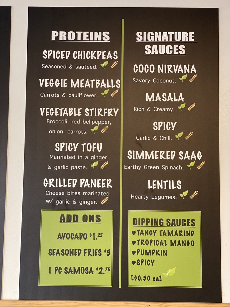 Lettuce, red bell pepper, onion, mint sauce. Pick a protein and curry sauce.